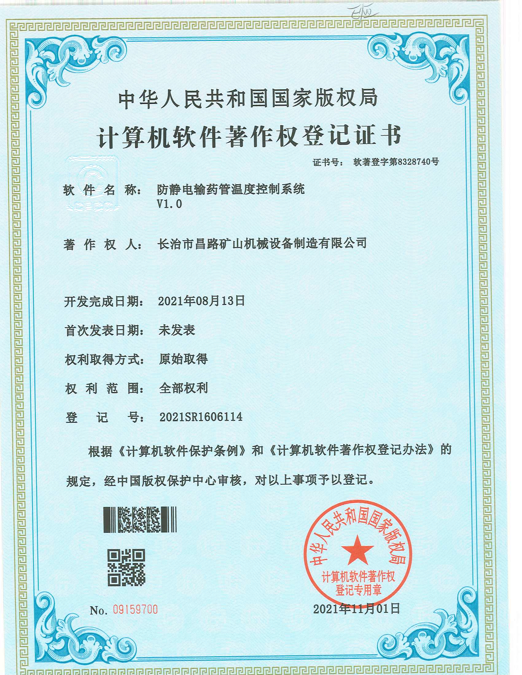 防靜電輸藥管溫度控制系統著作權登記證書
